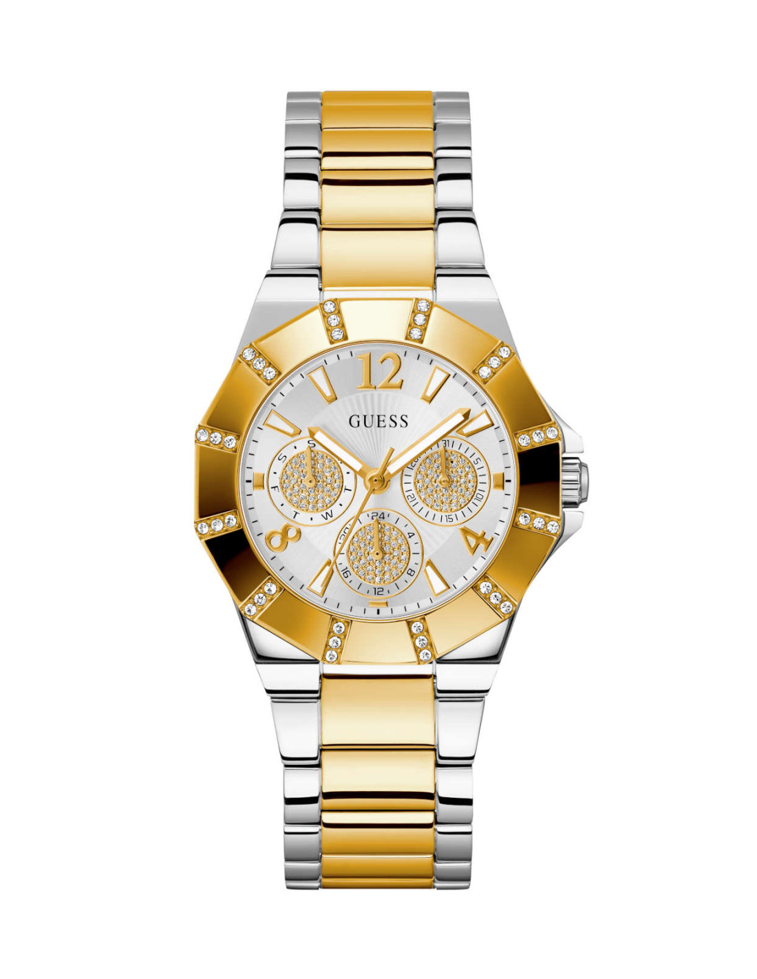 Γυναικείο ρολόι GUESS SUNRAY GW0616L2 διαμέτρου 36mm, με μηχανισμό QUARTZ Multi Function ακριβείας. Έχει ασημένιο καντράν διακοσμημένο με κρυστάλλους, επίχρυσους δείκτες και λεπτομέρειες.Η κάσα του είναι από ανοξείδωτο ατσάλι διακοσμημένη με κρυστάλλους και επίχρυσες λεπτομέρειες και κρύσταλλο από ορυκτό κρύσταλλο ειδικής σκλήρυνσης. Έχει ασημί και χρυσό μπρασελέ από ανοξείδωτο ατσάλι με επίχρυσες λεπτομέρειες και κούμπωμα ασφαλείας. Είναι αδιάβροχο (3 ΑΤΜ).