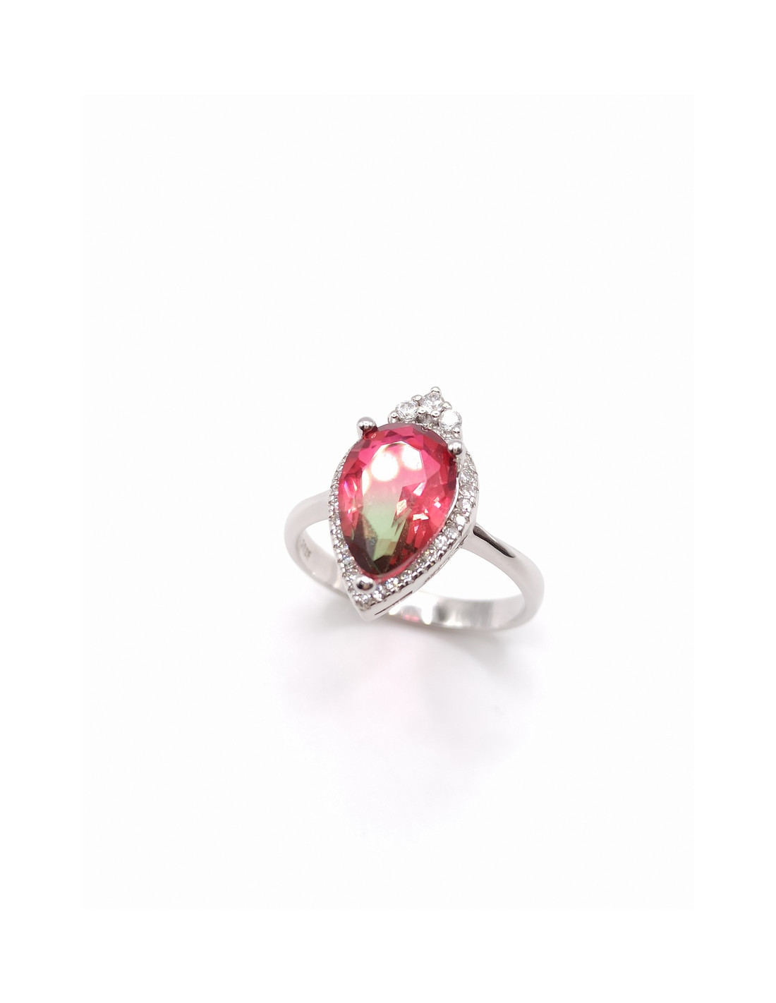 Χειροποίητο ασημένιο και επιπλατινωμένο δαχτυλίδι με ζιργκόν και στο κέντρο τουρμαλίνη ταγιέ σε σχήμα δάκρυ.
