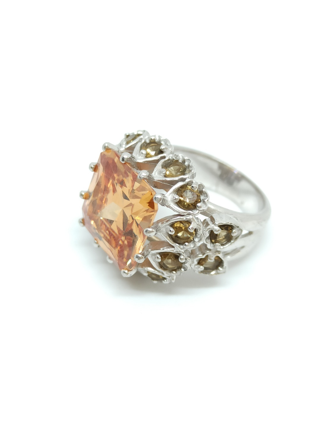 Χειροποίητο ασημένιο και επιπλατινωμένο δαχτυλίδι, με μία μεγάλη πέτρα Swarovski και γύρω της ζιργκόν.