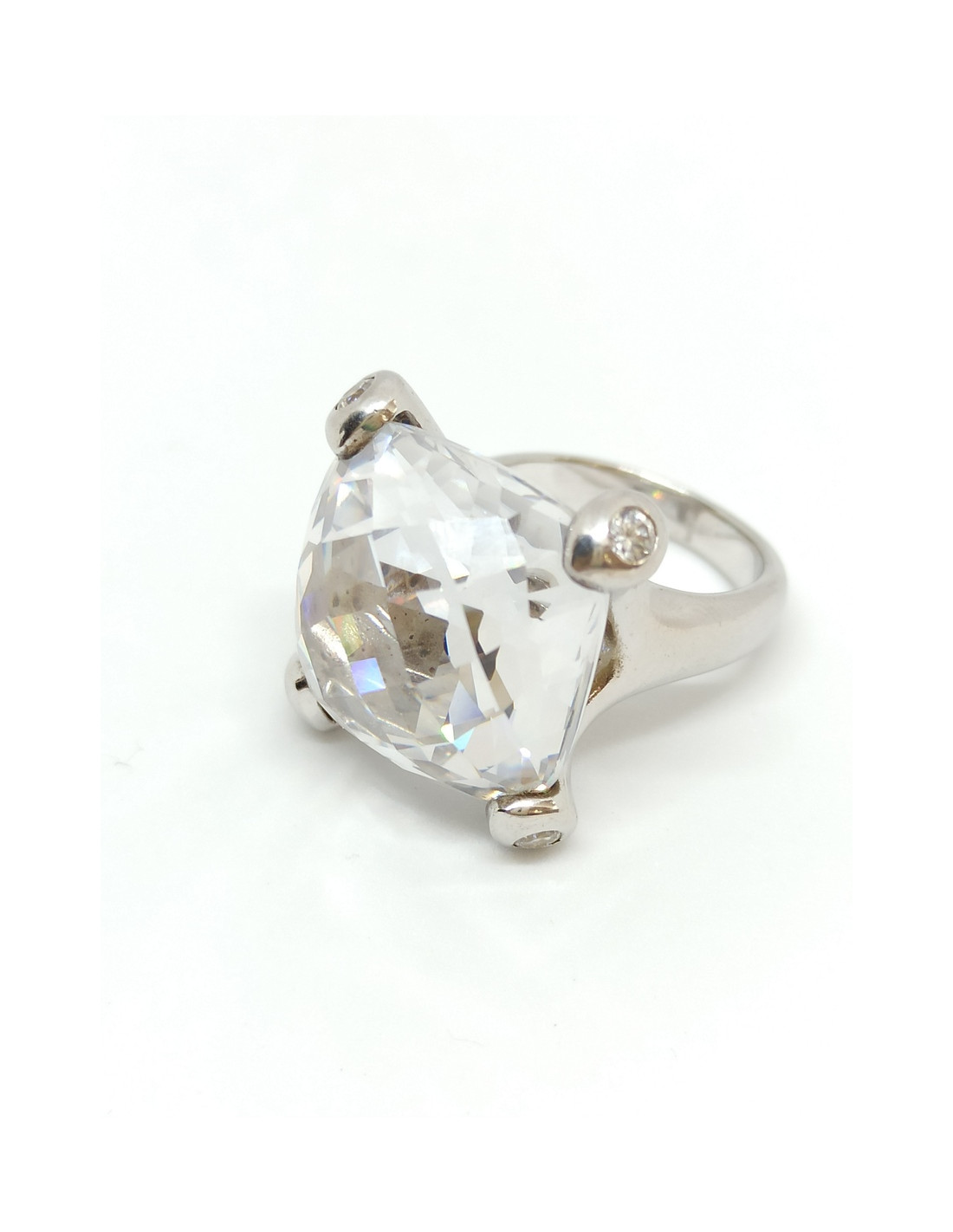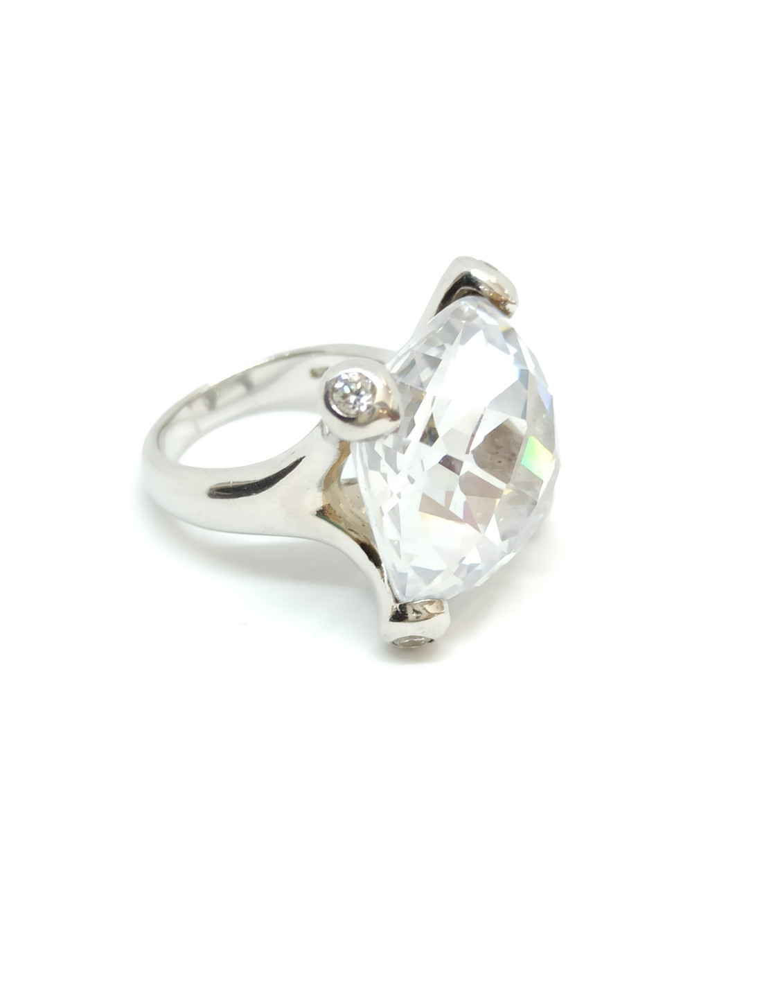 Χειροποίητο ασημένιο και επιπλατινωμένο δαχτυλίδι, με μία μεγάλη τετράγωνη πέτρα Swarovski και τέσσερα ζιργκόν στις γωνίες της.