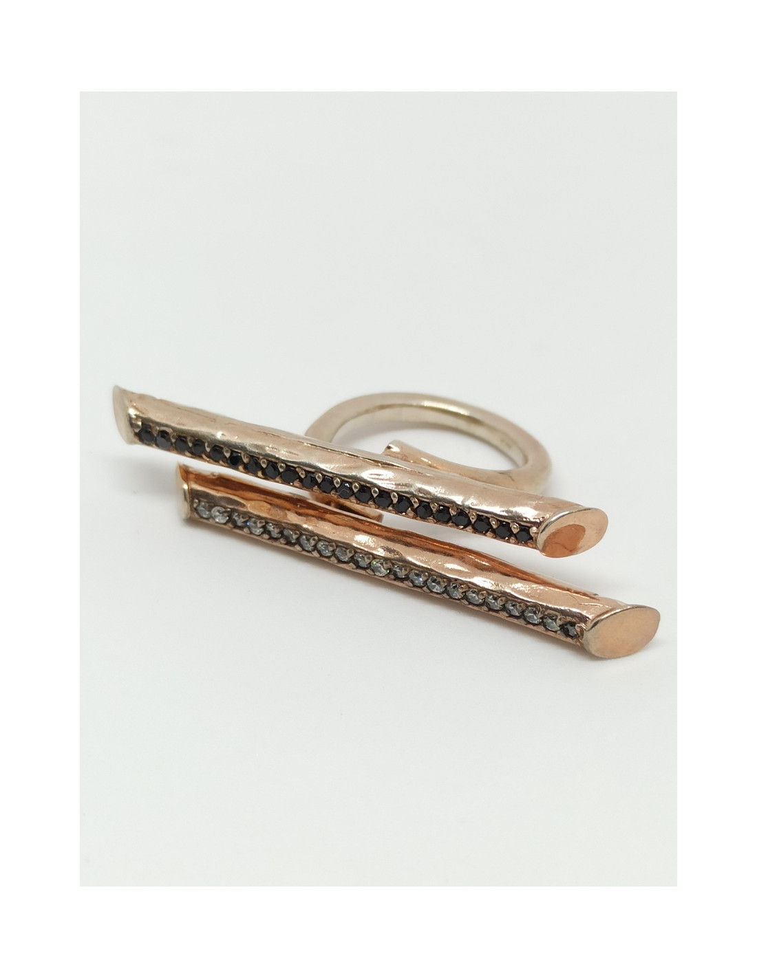 Χειροποίητο ασημένιο δαχτυλίδι με ροζ επιχρύσωση, λευκά και μαύρα ζιργκόν.
