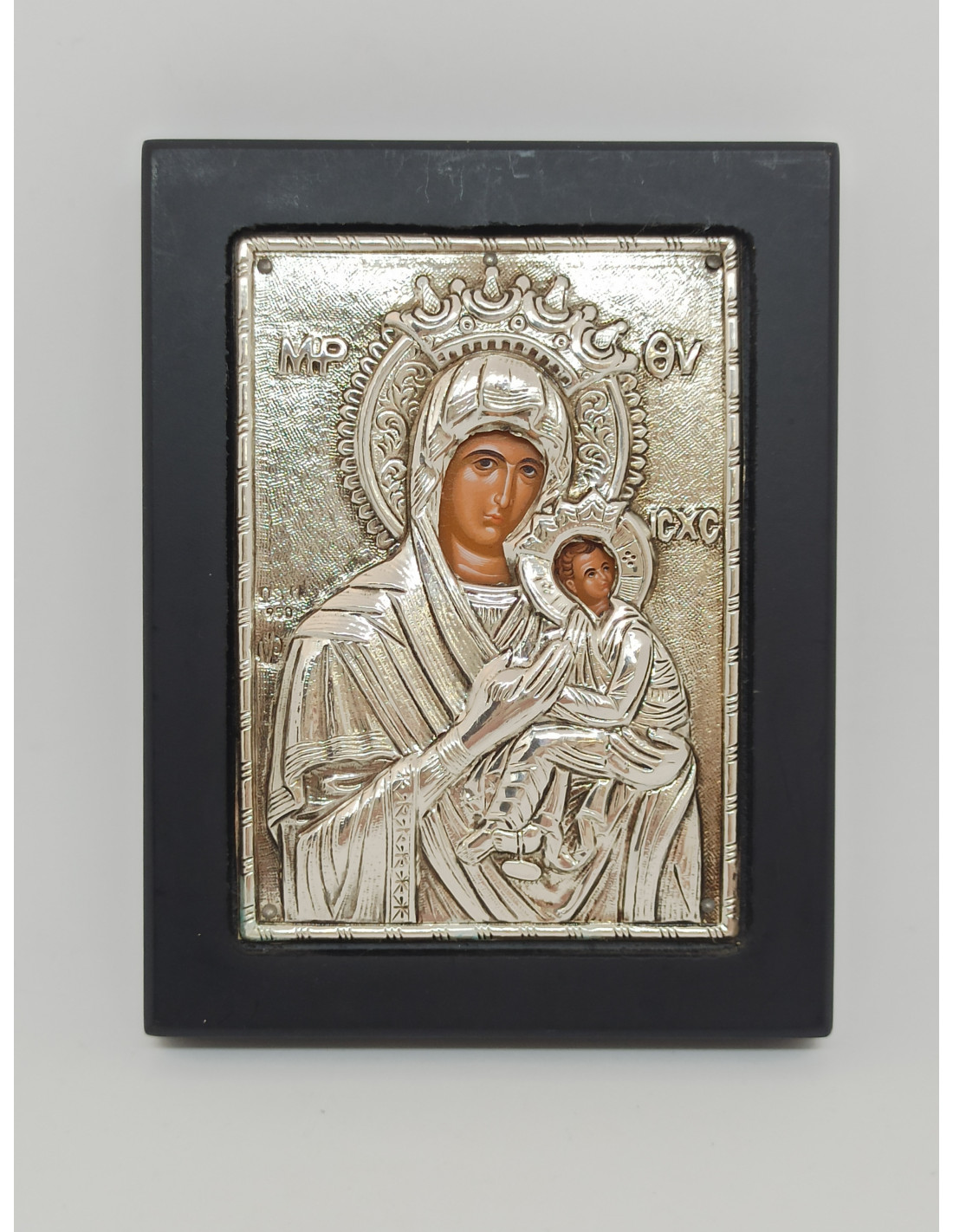 Ασημένια εικόνα της Παναγίας, ακριβές αντίγραφο της Βυζαντινής Τέχνης. Η αγιογραφία είναι ζωγραφισμένη στο χέρι.