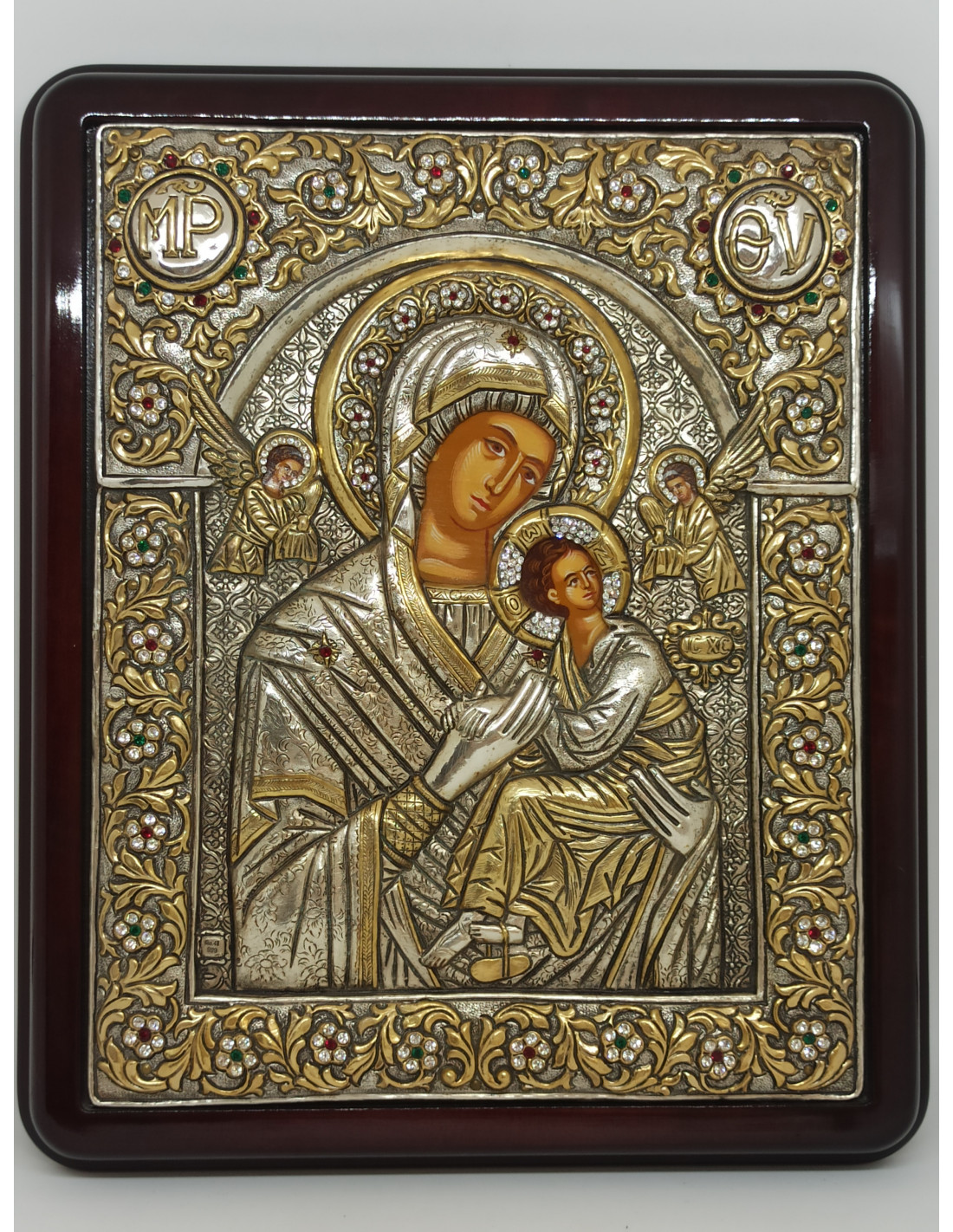 Ασημόχρυση εικόνα της Παναγίας, ακριβές αντίγραφο της Βυζαντινής τέχνης. Από καθαρό ασήμι 925, με τοπικές επιχρυσώσεις 24 καρατίων και αυθεντικά κρύσταλλα Swarovski. Τις αγιογραφίες έχουν επιμεληθεί διακεκριμένοι αγιογράφοι και έχουν ειδική επικάλυψη UV για να μην ξεθωριάζουν, το ασήμι δε μαυρίζει.
