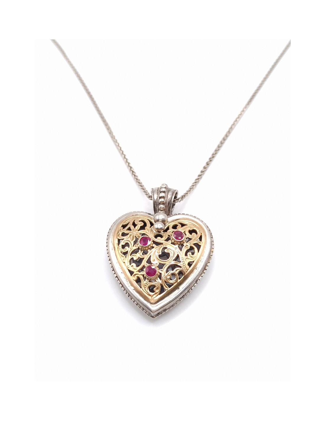 Ασημόχρυσα διάτρητα, χειροποίητα σκουλαρίκια καρδιές. Είναι αντίγραφο μουσείου, με χρυσό 18κ και ρουμπίνια.
