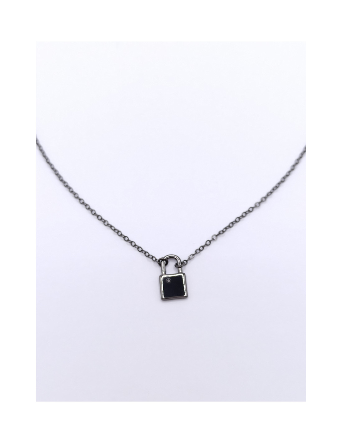 Ασημένιο κολιέ λουκέτο σε μαύρο χρώμα.