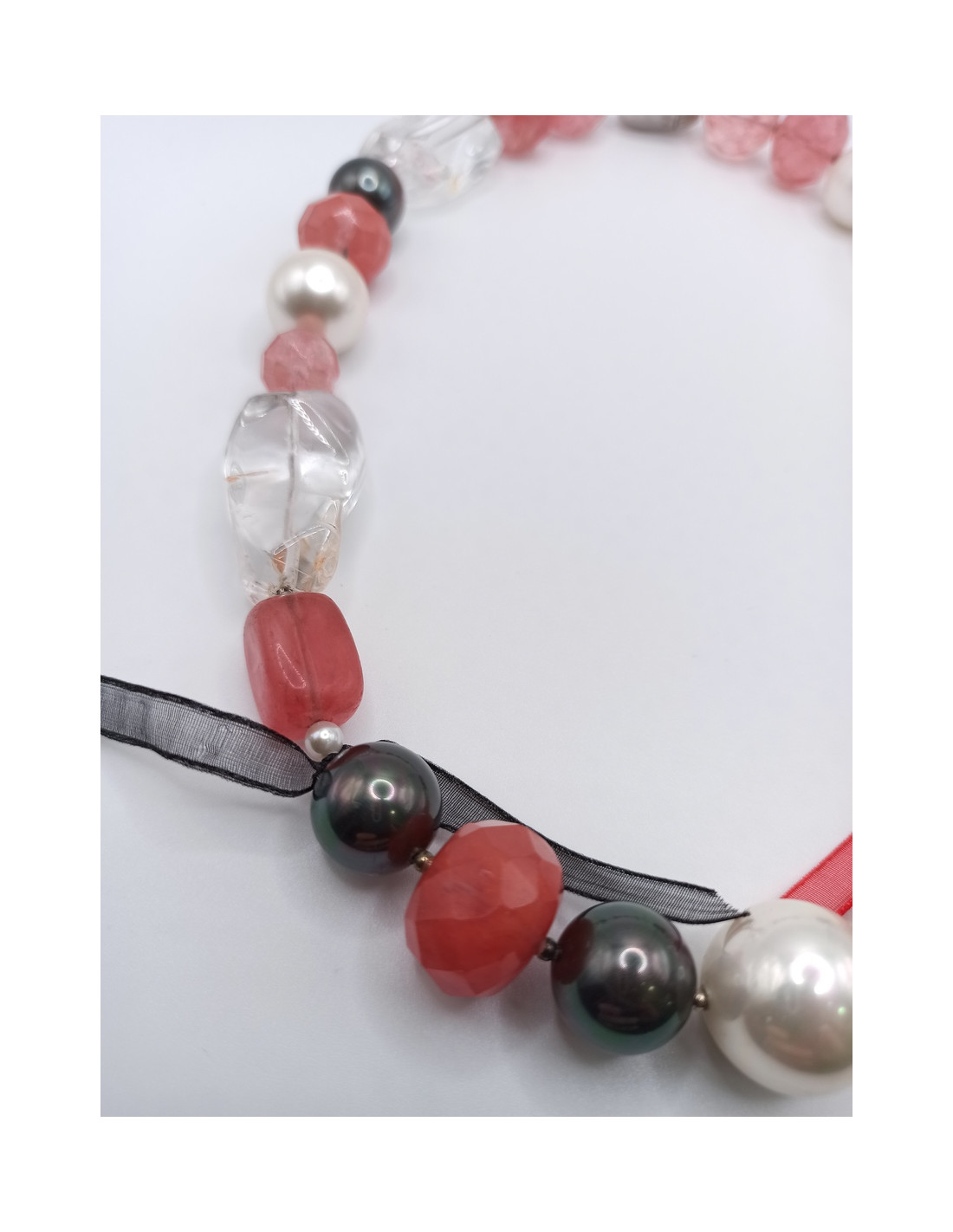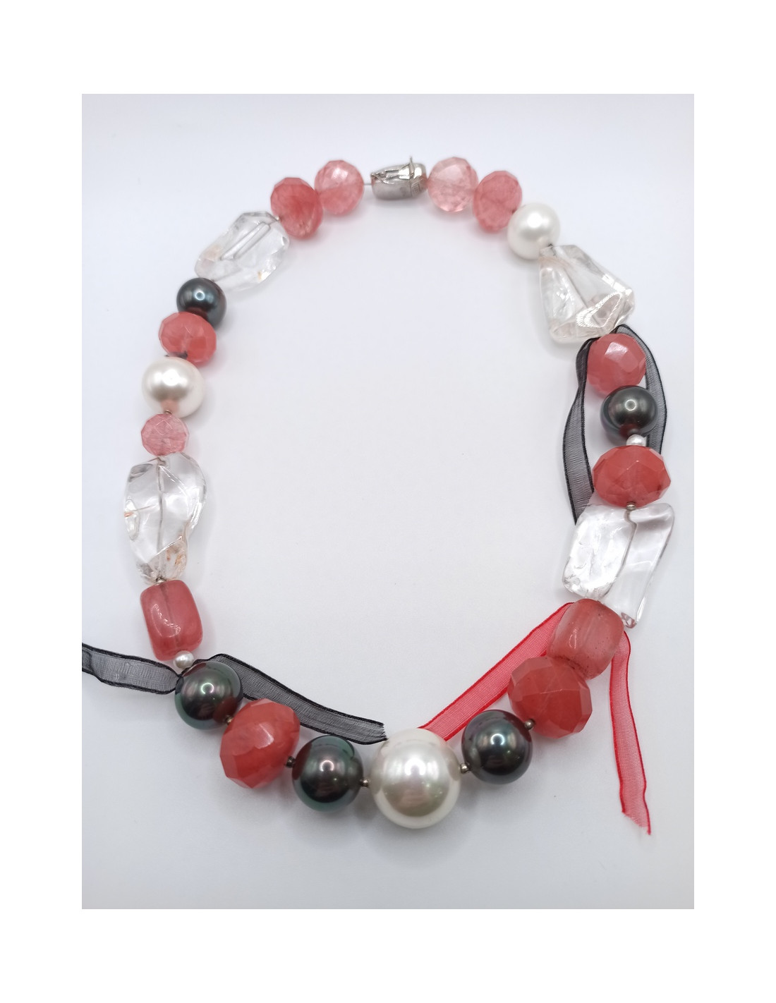 Χειροποίητο κολιέ με strawberry quartz, μαργαριτάρια, κρύσταλλο και ασημένιο κούμπωμα.