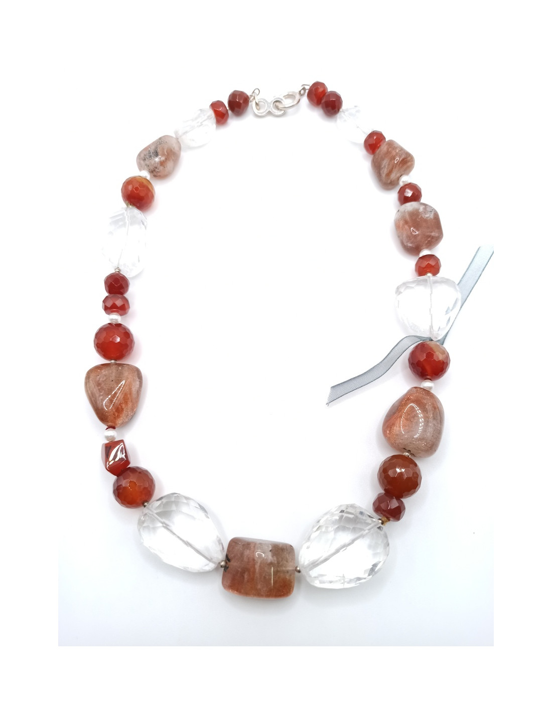 Χειροποίητο κολιέ με κορνεόλη, αχάτη, μαργαριτάρι, κρύσταλλο και ασημένιο κούμπωμα.