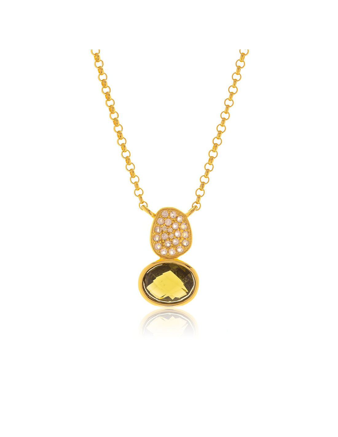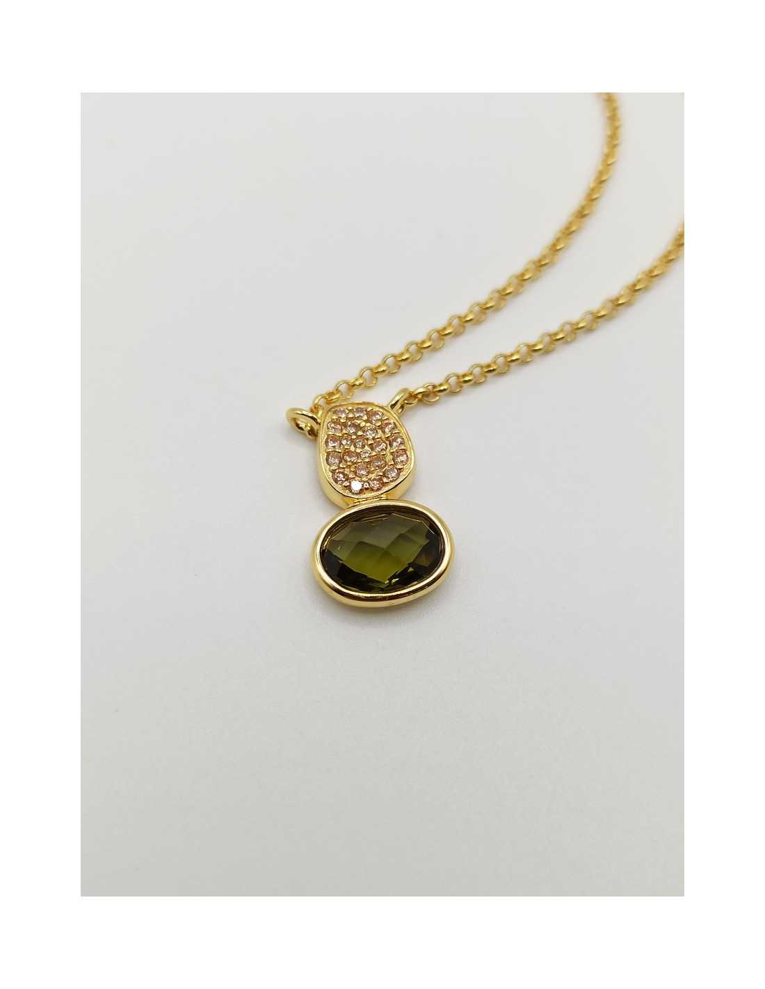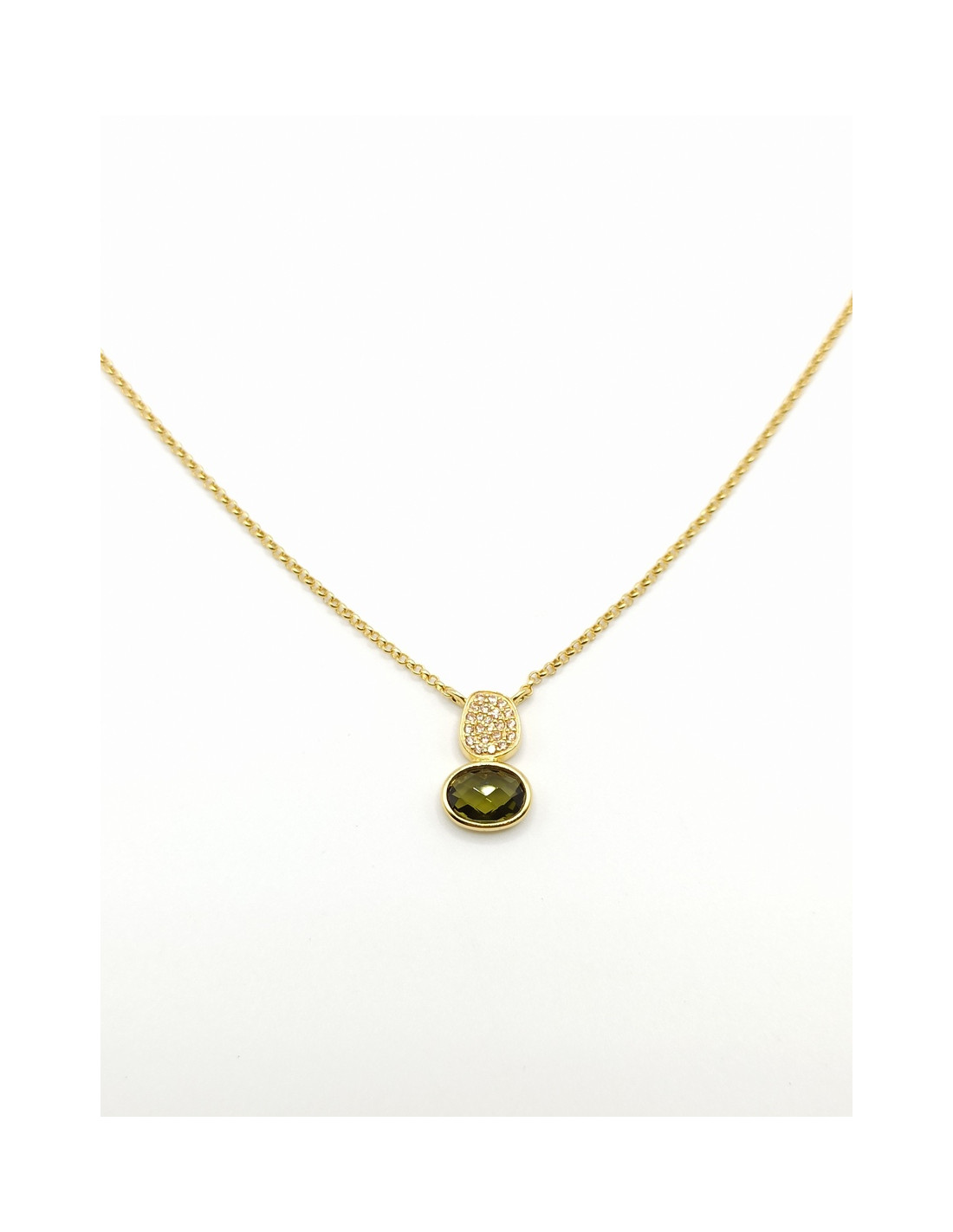 Υπέροχο κολιέ από επιχρυσωμένο ασήμι με Cat eye σε λαδί χρώμα και ζιργκόν.