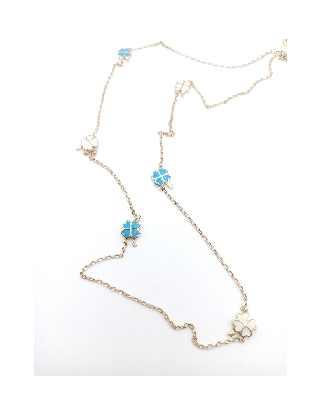Ασημένιο, επίχρυσο, μακρύ κολιέ με στοιχεία από σμάλτο λευκό και γαλάζιο.