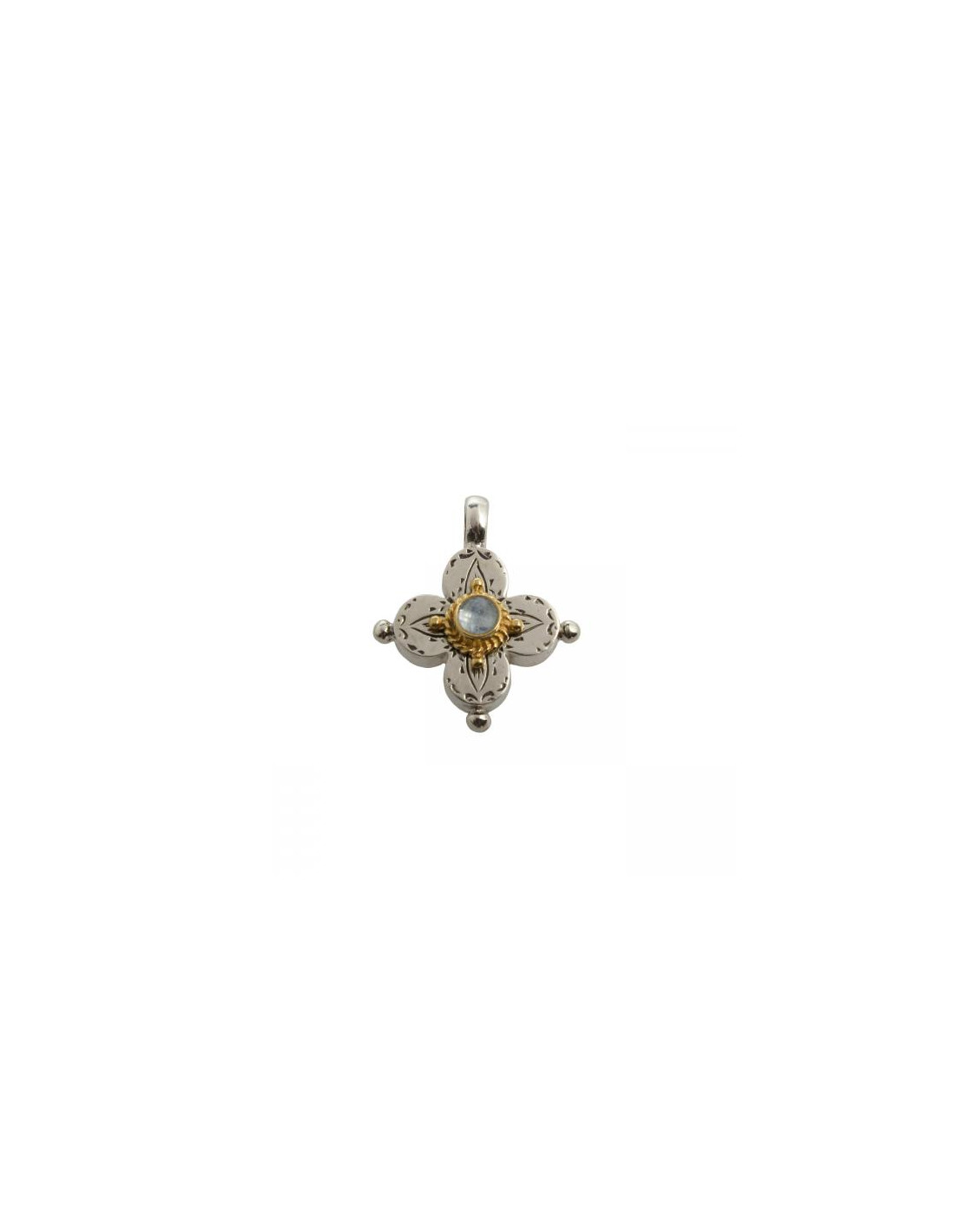 Εγχάρακτος χειροποίητος σταυρός από ασήμι 925 με επίχρυσα μέρη και τοπάζι μπλε ταγιέ.