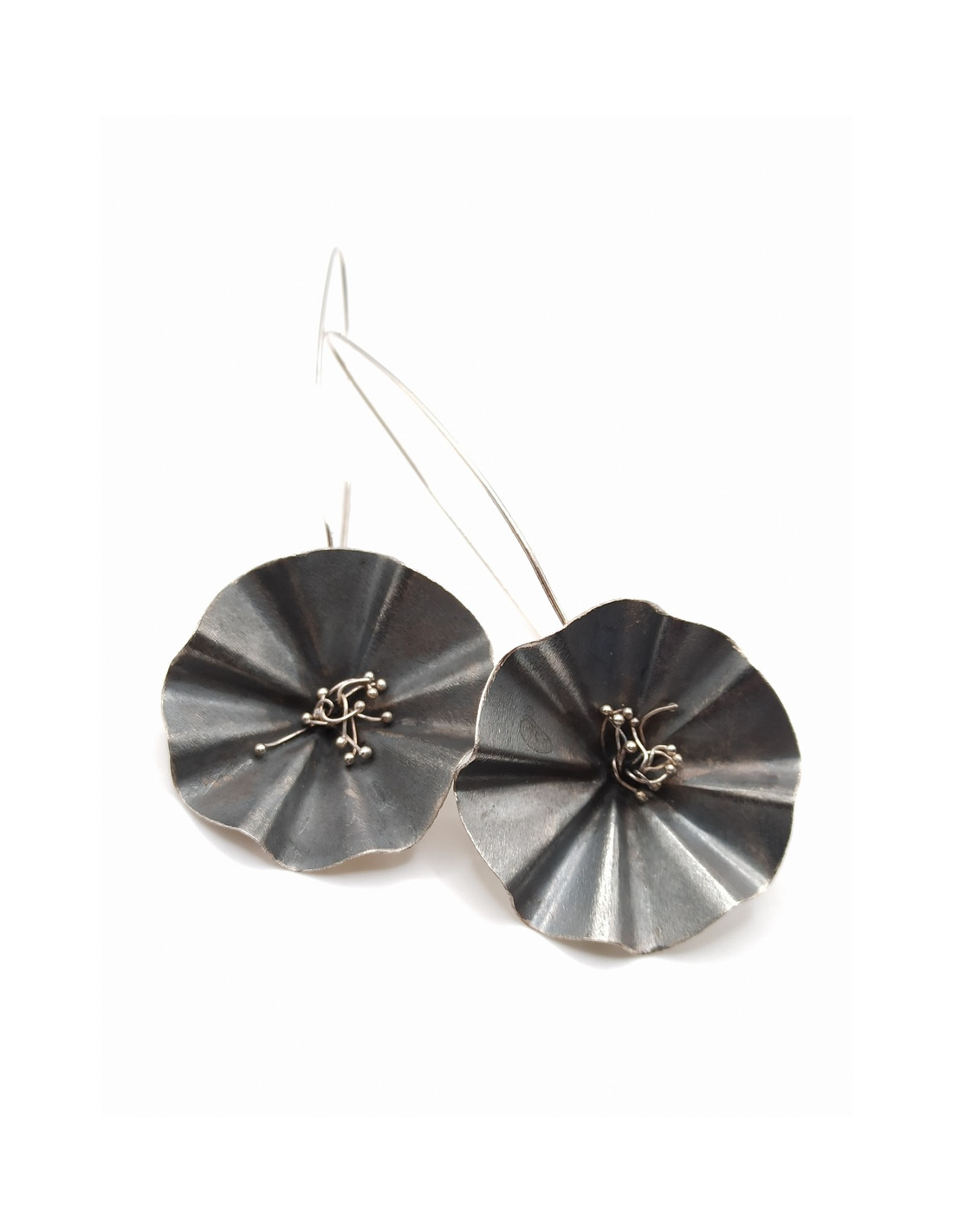 Ασημένια χειροποίητα μακριά σκουλαρίκια, με οξειδωμένα λουλούδια.